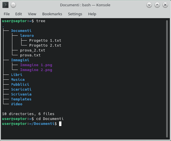 Quindi apriamo l terminale, digitareil comando con il comando tree per vedere l'albero delle dicectory della cartella home. Poi digitiamo il comando cd Documenti per spostarsi nella cartella Documenti: