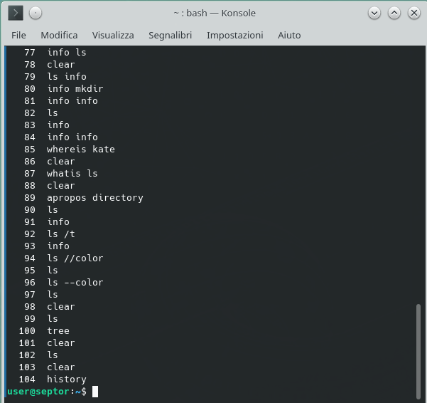 Vediamo i comandi che lavorano sulla cronologia dei comandi della shell: