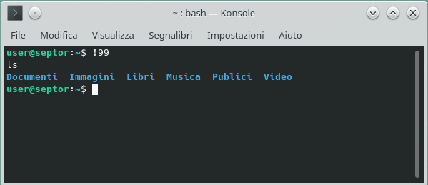 Nel mio caso se voglio inserre il comando numerato dalla cronologia come 99 digiterò nel terminale il seguente comando: