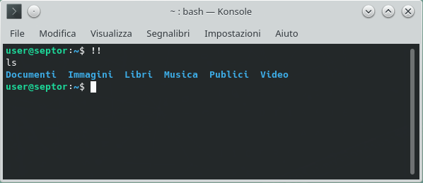 Se vuoi eseguire di nuovo l'ultimo comando che hai usato, inserisci due punti esclamativi. Questo cerca nel file della cronologia ed esegue l'ultimo comando nell'elenco.