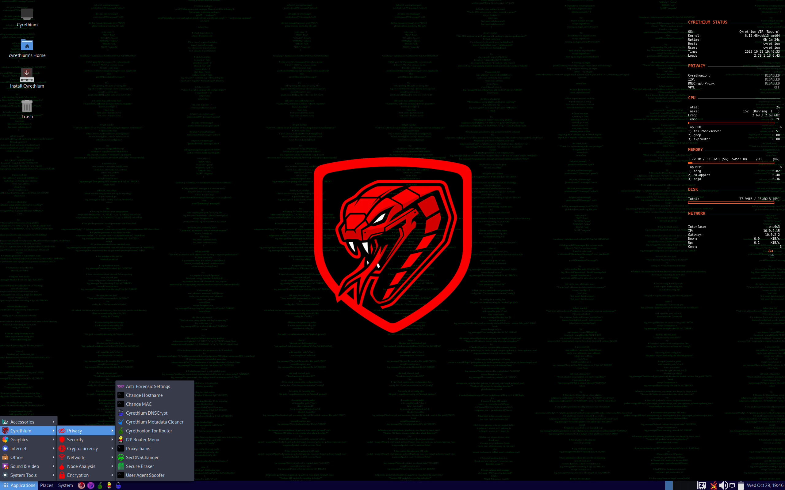 Cyrethium è una distribuzione Linux incentrata sulla privacy e sulla sicurezza basata sul ramo "Testing" di Debian. Include uno strumento preconfigurato che forza tutte le connessioni in entrata e in uscita attraverso la rete Tor. Il sistema viene precaricato con vari strumenti di privacy e sicurezza, insieme ad alcune utility sviluppate su misura. Cyrethium utilizza l'ambiente desktop MATE. Può essere eseguito in modalità live o installato in modo permanente utilizzando il programma di installazione Calamares. L'obiettivo di Cyrethium è quello di fornire un sistema sicuro adatto all'uso quotidiano.