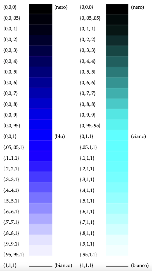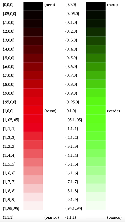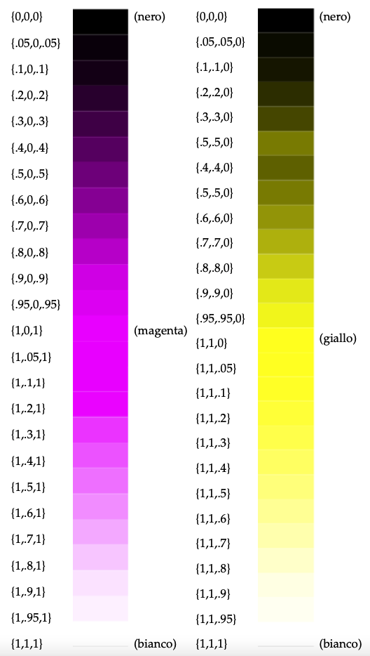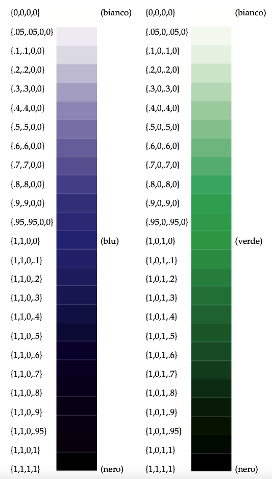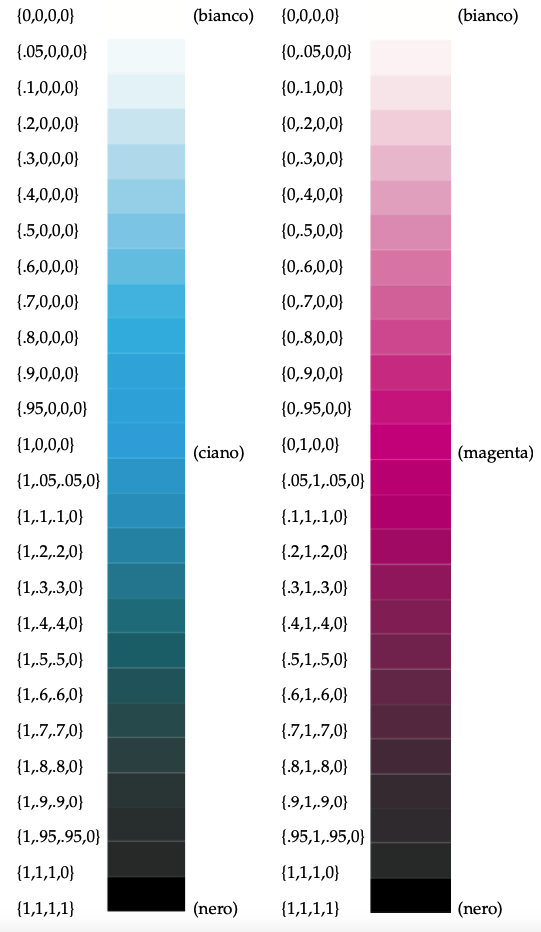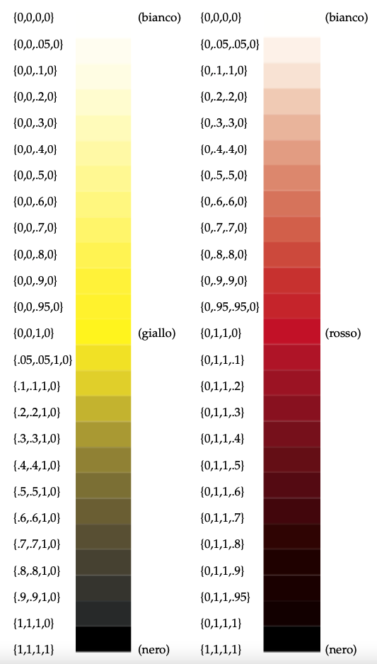In questo capitolo riporto, per ogni modello di colore, le scale cromatiche dei colori base affiancate dalle combinazioni numeriche corrispondenti ad ogni tonalità di colore.