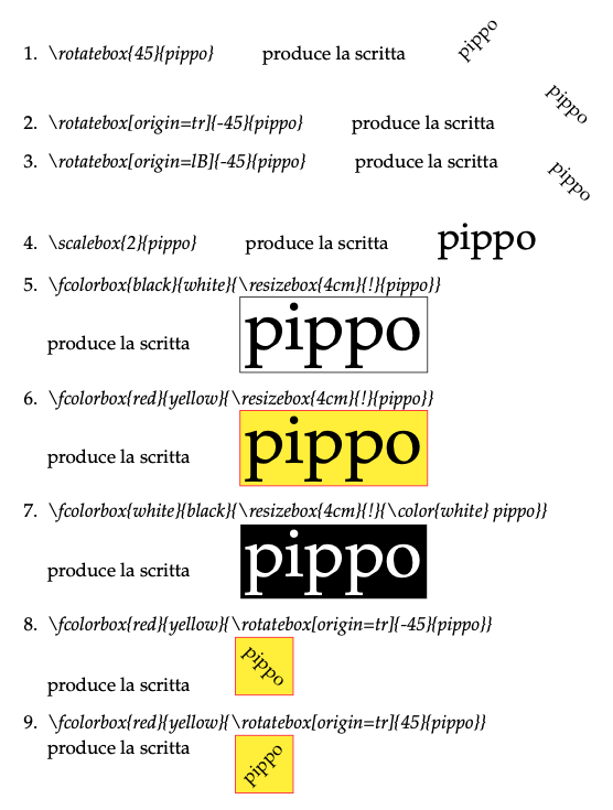 Il pacchetto graphicx è il metodo standard per l’inclusione di oggetti grafici esterni, ma anche per creare effetti grafici di rotazione, ingrandimento o riduzione di normale testo. E’ la possibilità di creare effetti grafici di rotazione o ingrandimento di normale testo che mi interessa e che qui spiegherò.
