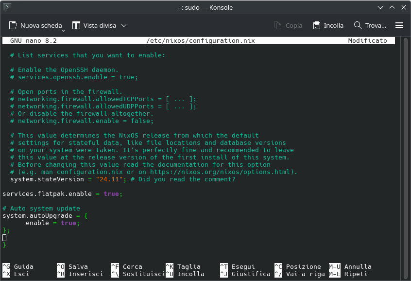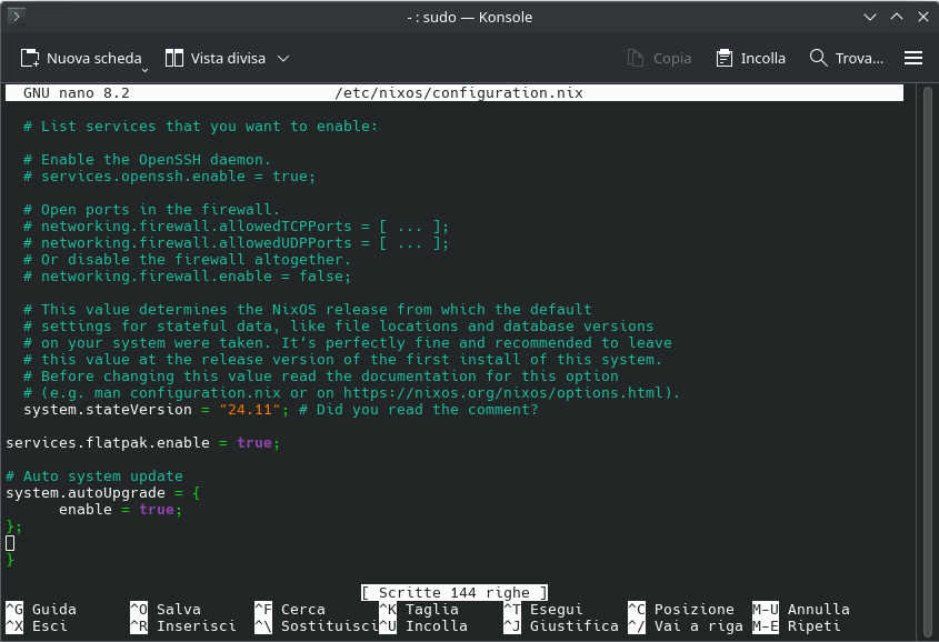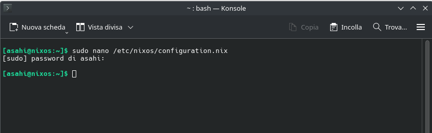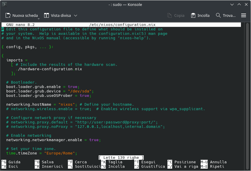 Innanzitutto bisogna aprire il file configuration.nix con i privilegi di amministratore digitando nel terminale la seguente stringa: