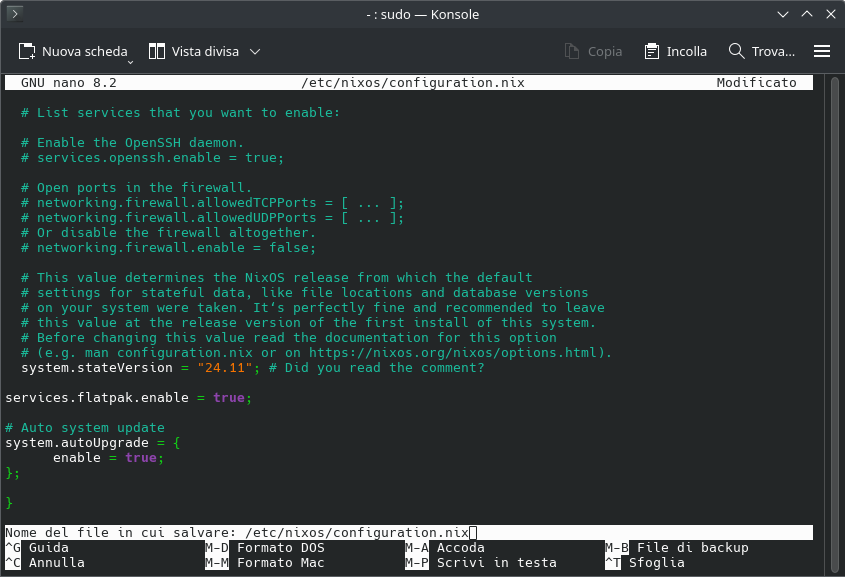 Salvare il file configuration.nix premendo in contemporanea i tasti CTRL+ O: