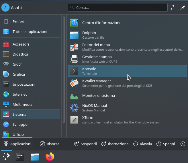 Andare sull'icona della barra dei programmi e selezionandola si aprirà la barra dei menù. Selezionare la voce "Sistema" e sul menù che si apre selezionare il programma "Konsole":