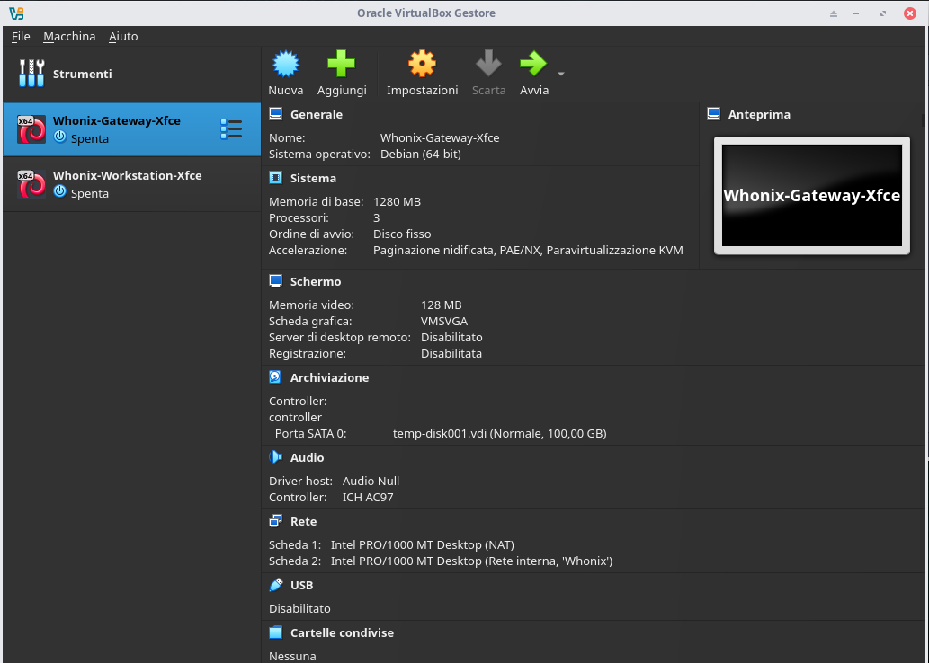 Selezionare "Whonix-Gateway-Xfce" e poi premere il pulsante "Avvia".