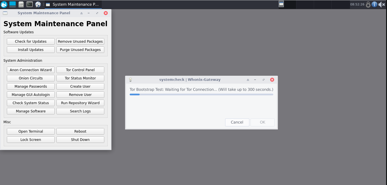 Si avvierà in automatico "systemcheck | Whonix-Gateway" che ci connetterà alla rete Tor.